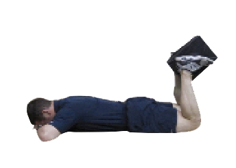 In prone position, dorsiflex feet and flex knees to 90 degrees while keeping feet and legs hip to shoulder width apart. Place pillow, foam roller, yoga block or other similar tool evenly between feet and ankles. As you squeeze pillow, engage glutes to achieve hip extension. Hold each contraction for 1–2 seconds (50%–70% intensity).
