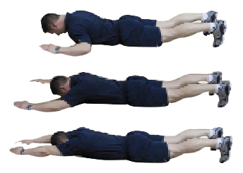 Assume prone position on floor. Dorsiflex feet and ankles, and posteriorly tilt pelvis if necessary to achieve neutral spine. Begin with arms extended above head and touching (palms down). Slowly bring arms toward knees. As arms pass by shoulders, lift head,