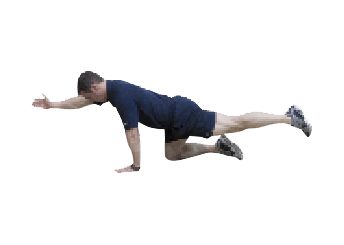 From quadruped position, brace abdominals and extend contralateral arm and leg. Maintain original hand and knee placement, and keep hips level throughout exercise. Head and
