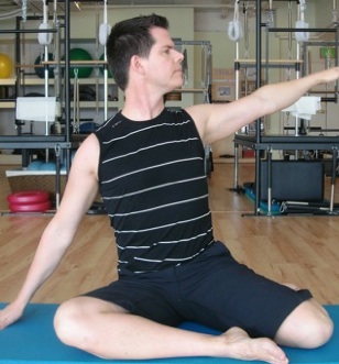 Start seated on floor or with pelvis toward one side of a step (tight-hip modification). Spine is neutral, shoulders over hips, left leg bent and internally rotated, right leg externally rotated, foot touching top of left knee. Right hand rests lightly on floor. Left arm is to side, in line with shoulder. Rotate and flex spine, with arm following around in line with shoulder as if you were hugging a beach ball, then bring spine back to neutral and continue to rotate toward other leg, keeping arm slightly higher than shoulder. Repeat on opposite side.