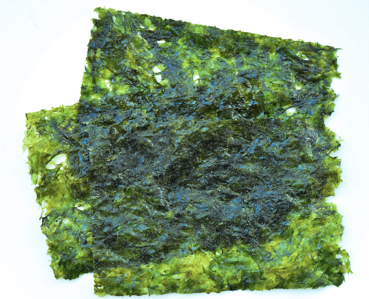 Dried seaweed snacks are much like the nori used to wrap sushi. Nori is made from red algae, which is shredded and dried in flat sheets. One study found that women who consumed a sheet of gim (the Korean equivalent of nori) every day had a lower risk of breast cancer than women with lower seaweed intake (Yang et al. 2010).