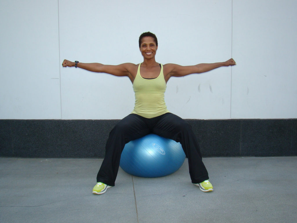 Sit on the ball, feet about hip distance apart, heels down, and bounce up and down. Hold the sides of the ball if needed; otherwise, extend the arms back into a triceps extension on each downbeat. Think of bouncing up—almost off the ball—instead of being heavy and bouncing down “into” the ball. This will loosen up the low-back muscles and get your heart rate pumping. Add hip circles once you stop bouncing (the two moves work well together). Draw a circle with your hips, 8-10 times in one direction and then 8-10 times in the opposite direction. This is a great way to begin any dance-based workout.